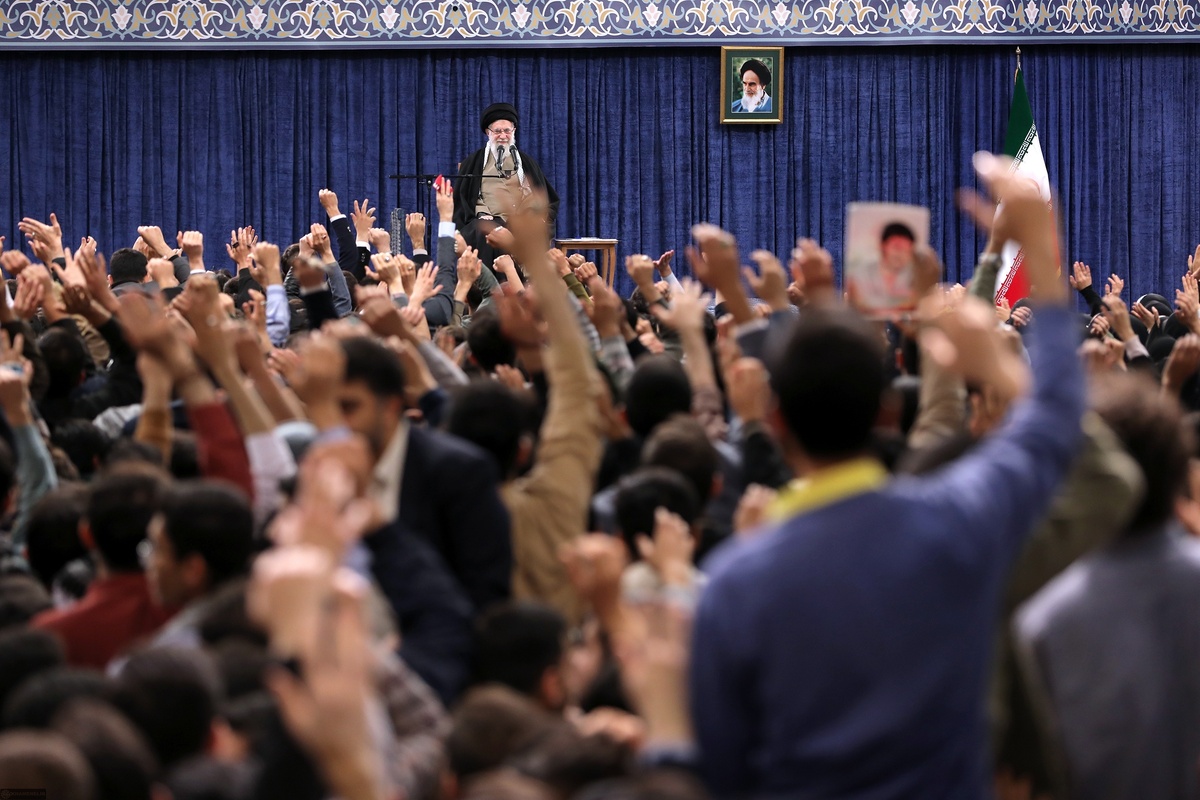 حدود ساعت ۱۶ رهبر معظم انقلاب اسلامی در میان دانشجویان حاضر شدند. دانشجویان به احترام ایشان بلند شدند و با صلواتی گرم خوشامدگویی کردند. فضای سالن از شور و شوق فراوان پر بود به طوری که همه ی دانشجویان هماهنگ و یک صدای شعری در مدح ایشان قرائت کردند که نشان دهنده ی عشق و ارادت آنها به رهبرشان بود.